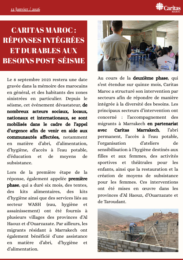 Nos articles Réponses intégrées et durables post-séisme ENG ESP Communiqué – Douleurs et solidarité avec les victimes des inondations à Safi La paix comme bien commun dans la région méditerranéenne ENG ESP Journée mondiale des droits de l’enfant ENG ESP Rendre accessible l’école à tous ESP Caritas Marrakech porteuse d’espérance ENG ESP « Dans cette nouvelle maison nous nous sentons en sécurité » ENG ESP Pour une économie au visage féminin ENG ESP Les jeunes au cœur du changement ENG ESP Naïma, une présidente entreprenante et généreuse ENG ESP RAEMH – Tisser la communauté depuis Rabat ENG ESP Clôture des deux phases du projet d’urgence ENG ESP Tamaziste Tikirt ENG ESP Tamaziste Tikirt ENG ESP Vivre et reconstruire L’histoire de Hassan à Tiniskt ENG ESP A la rencontre de Caritas Tanger ENG ESP Résilience en action ENG ESP Rencontres des Caritas sœurs ENG ESP Coopérative Rowad Tanmia ENG ESP Notre Nature est Belle Et encore plus belle quand elle est partagée ENG ESP PEACEMED Un engagement pour la paix ENG ESP Les « Panier Ramadan Kareem » Caritas Maroc et Caritas Marrakech main dans la main ENG ESP Caritas Maroc Reconstruction et Solidarité à Tiniskt ENG ESP Caritas Maroc participé a la Rencontre Confédérale de Coopération Fraternelle de Caritas Española ENG ESP Hawd Setti Fatma Préserver le Patrimoine Naturel ENG ESP Spect’ Act et Cartitas Maroc Au service des enfants ENG ESP Jour de fête à la coopérative Zarbiat Achbarou ENG ESP Des couturières entrepreneures Savoir-faire, autonomie et solidarité ENG ESP Sourire après secousses La résilience des jeunes ENG ESP Ne nous oubliez pas ! Une pompe à eau pour Achdir ENG ESP Caritas Maroc Un chemin ensemble! ENG ESP En visitant Caritas Senegal Alliance pour le développementet la migration sûre ENG ESP Reconstruire des communautés L’impact de Caritas Maroc à AlHaouz et Ouarzazate ENG ESP Tisser des liens et faire route ensemble chez Caritas Laâyoune ENG ESP L’énergie solaire Un Moteur de Changement dansles Villages du Haut Atlas ENG ESP Zarbiat Achbaru D’une tente à un atelier enpleine expansion ENG ESP Caritas pour Atlas Mission et visite à Aghbar et Tiniskt ENG ESP Collaboration Le témoignage d’une bénévole ENG ESP Rencontre « Frontera Sur » à Malaga ENG ESP PEACE PARTY par Caritas Canada ENG ESP Trouver Dieu dans l’adversité ENG ESP