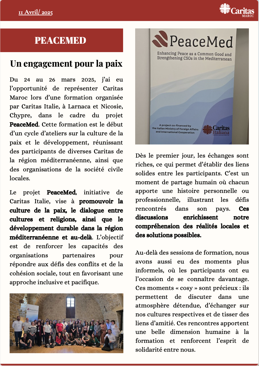 Caritas Italiana met en œuvre le projet PeaceMed, visant à promouvoir la paix et le développement durable dans les communautés méditerranéennes. L’objectif principal est de renforcer les compétences des opérateurs des Organisations de la Société Civile (OSC) pour leur permettre de former et sensibiliser des animateurs, éducateurs et jeunes sur des initiatives concrètes favorisant la paix, le développement durable et l’intégration régionale.
