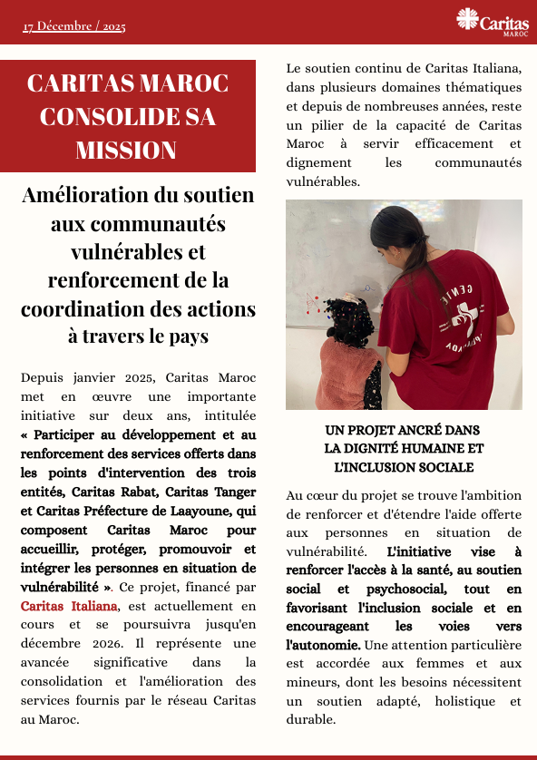 Depuis janvier 2025, Caritas Maroc met en oeuvre un projet intitulé « Participer au développement et renforcement de l’accompagnement communautaire assuré au niveau des points d’intervention des trois entités composant Caritas Maroc, afin d’accueillir, protéger, promouvoir et intégrer les personnes en situation de vulnérabilité ». Ce projet est soutenu par Caritas Italiana, et vise à renforcer l’accès aux soins de santé ainsi qu’à l’accompagnement social et psychosocial, tout en promouvant l’inclusion sociale et en encourageant des parcours vers l’autonomie.