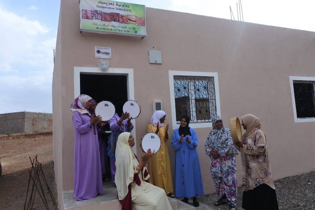La coopérative Tamaziste Tikirt produit du couscous à partir de blé ou d’orge, et des pâtisseries et biscuits variées. La présidente Jalila précise que « les recettes sont amazighes et ancestrales, transmises par les ainées du village. » Cette coopérative a été créée en janvier 2023 par quelques femmes qui avaient un savoir-faire, du temps disponible et un désir d’être plus active. Elles se sont organisées en travaillant ensemble chaque jour chez l’une, puis chez l’autre, accueillant l’équipe à tour de rôle. Cela leur permettait de travailler ensemble et s’entraider. Puis l’une d’entre elles a mis à disposition de la coopérative un garage qui leur a permis de se retrouver pendant 18 mois, pour travailler et cuisiner ensemble. Avec le séisme de septembre 2023, le village a été bien endommagé. Certaines familles ont perdu leur maison. D’autres femmes ont rejoint la coopérative. Le garage s’étant avéré trop exigu, la coopérative avait besoin de s’agrandir. L’équipe Caritas l’a rencontré comme elle a rencontré un certain nombre de coopératives afin d’écouter les besoins de chacune et voir les urgences. C’est en voyant leur implication et leur joie d’entreprendre que Caritas a choisi d’aider à la construction d’un local plus grand pour permettre à cette coopérative d’accueillir plus de membres et se développer. Le superviseur technique de Caritas Maroc leur a alors proposé un plan du futur local qui a été accepté.