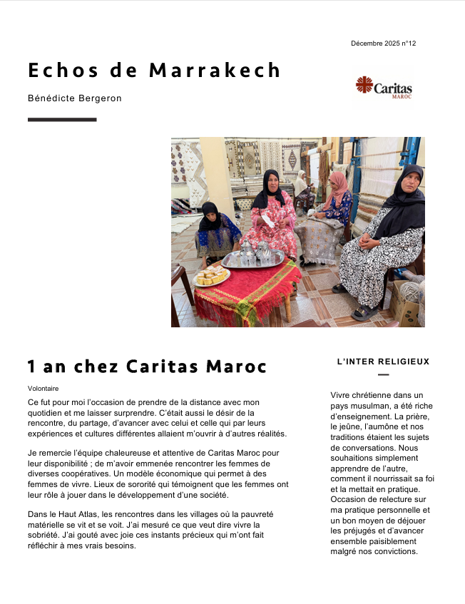Depuis janvier 2025, Caritas Maroc met en œuvre un projet intitulé « Participer au développement et renforcement de l’accompagnement communautaire assuré au niveau des points d’intervention des trois entités composant Caritas Maroc, afin d’accueillir, protéger, promouvoir et intégrer les personnes en situation de vulnérabilité ».